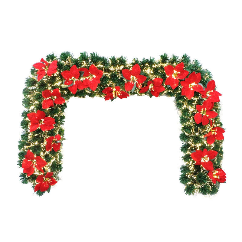 Flores de nochebuena rojas. Guirnalda con ramas densas y simétricas para enmarcar espacios. Luces LED cálidas integradas, distribuidas uniformemente para un brillo acogedor. Ideal para puertas, ventanas o chimeneas.