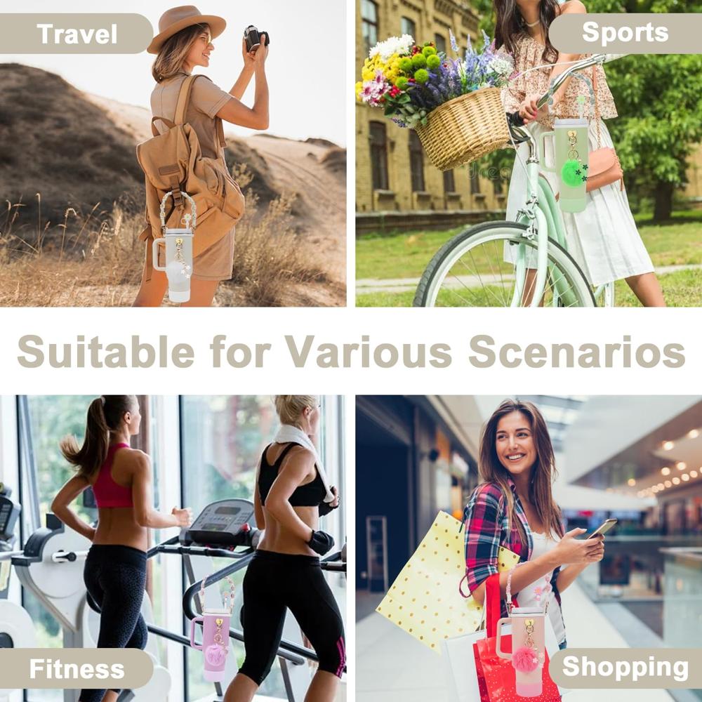 El juego incluye: 1 correa para el asa de la botella de agua, 1 funda para botella de agua, 1 funda de pajilla de silicona, 1 bola de pompón, 1 llavero de margarita, 1 gancho de corazón. El producto no incluye tazas.